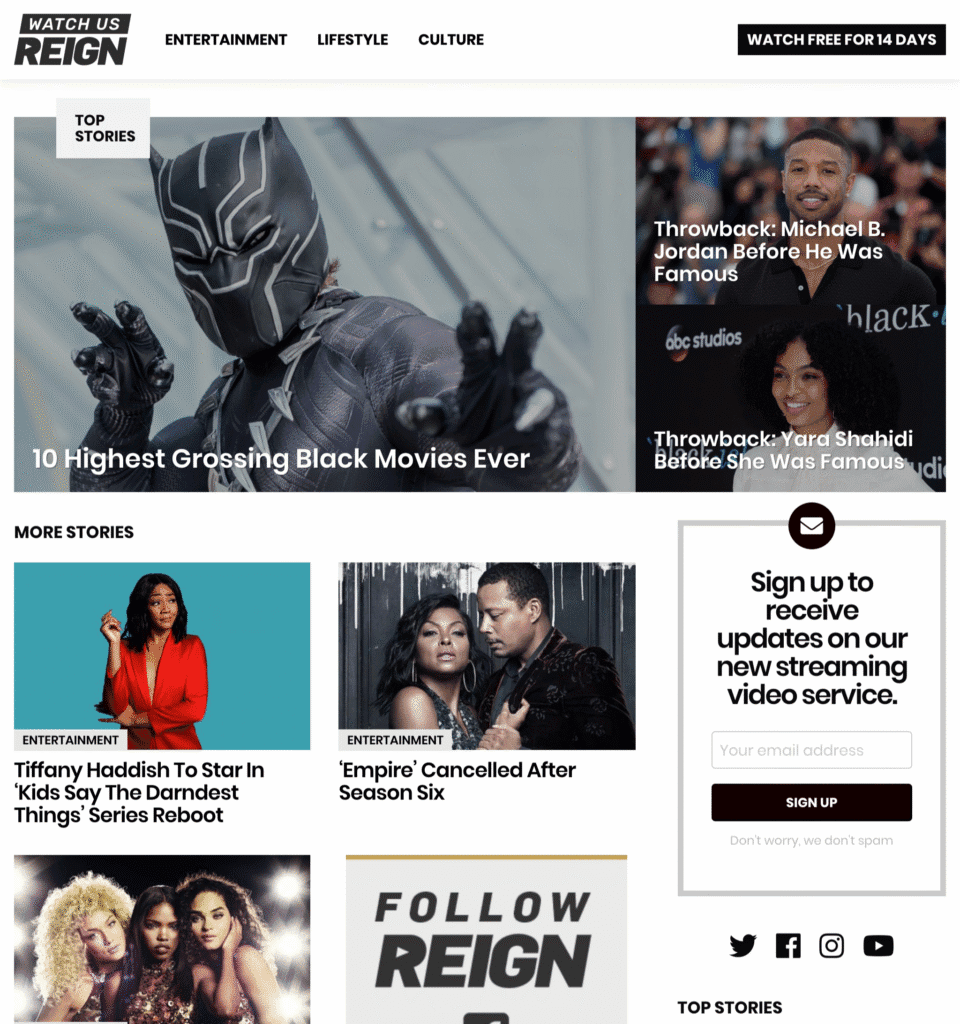While working at Reign.com in 2018, I also built their content marketing blog, “Watch Us Reign,” using WordPress. The primary purpose of this blog was to drive web traffic and generate interest in the main Reign.com platform by publishing relevant content and engaging potential users. It served as a key tool in their digital marketing strategy.